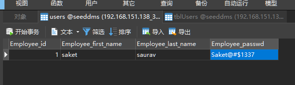 tblUsers表中发现登录用户admin,同时在users表中发现一个用户名、密码saket/Saket@#$1337