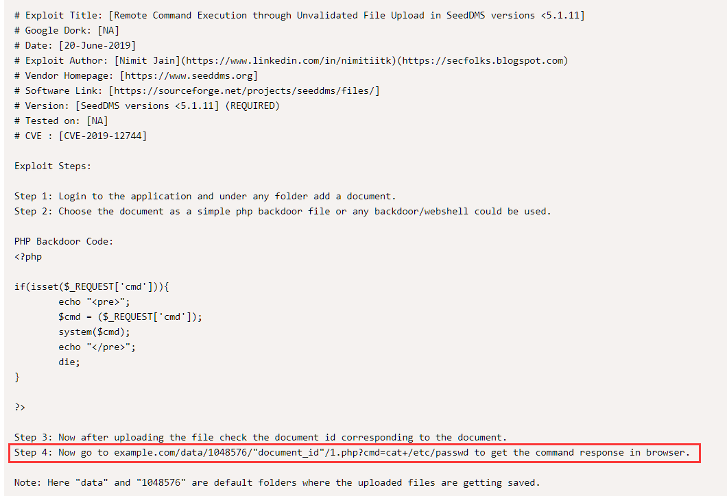 seeddms有一个任意文件上传的漏洞,其实就是刚才我用的洞,但是在exploit.com上,有人给出了上传文件的相对路径,链接:https://www.exploit-db.com/exploits/47022