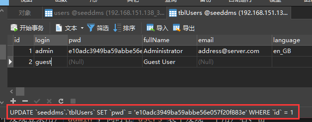123456的MD5值e10adc3949ba59abbe56e057f20f883e替换该密码