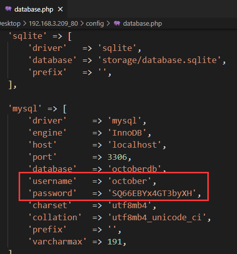 ./config目录下发现database.php数据库文件,打开文件,发现默认密码