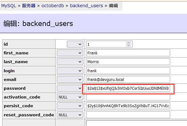octoberdb库中的backend_users表找到登录用户名和密码,但是看不出密码的加密算法