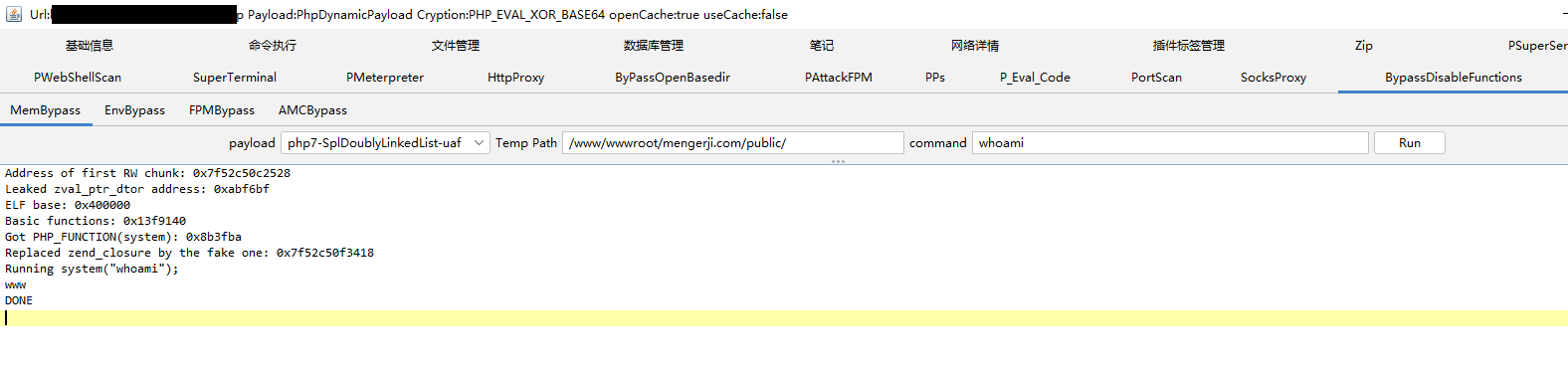 LD_PRELOAD实现绕过php禁用函数的文章,最近同事搞了一个宝塔的站,发现无法执行命令,通过Godzilla发现可以使用php7-sqldoublylinkedlist-uaf这个插件绕过禁用函数执行命令,于是本文主要就是来看看如何使用PHP中的SplDoublyLinkedList绕过禁用函数首先来看看效果